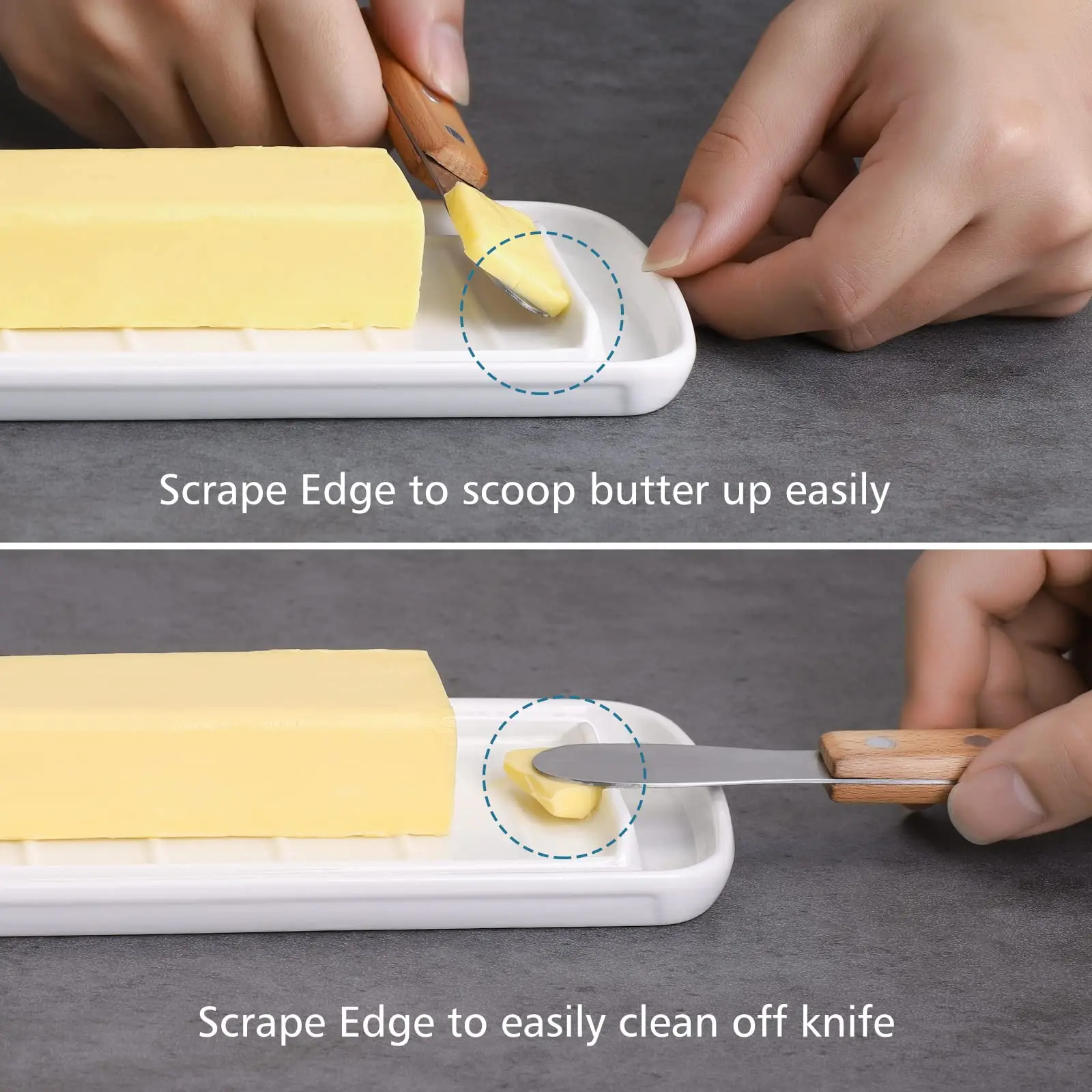 Nucookery White Porcelain Butter Dish with Clean Table Design Raised Non-Slip Ceramic Plate with Lid for Countertop Use details