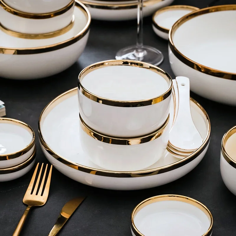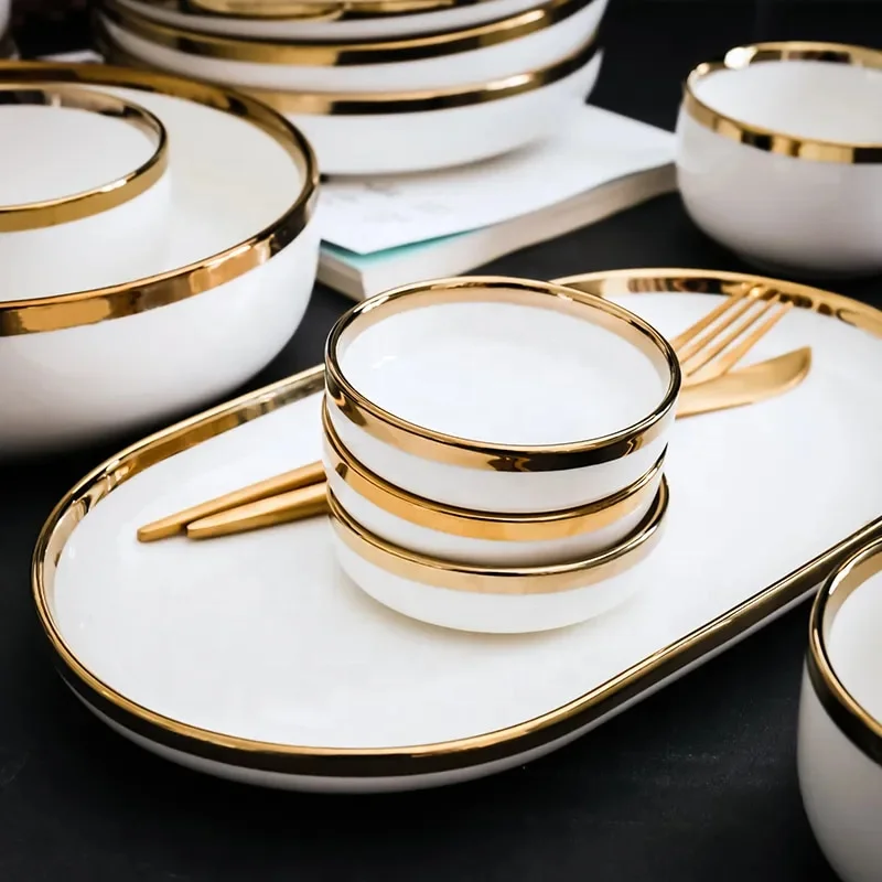 Qianyue HoReCa Gold Rim Dinnerware Set Ceramic Nordic Porcelain Flat Dinner Plates for Wedding Restaurant
